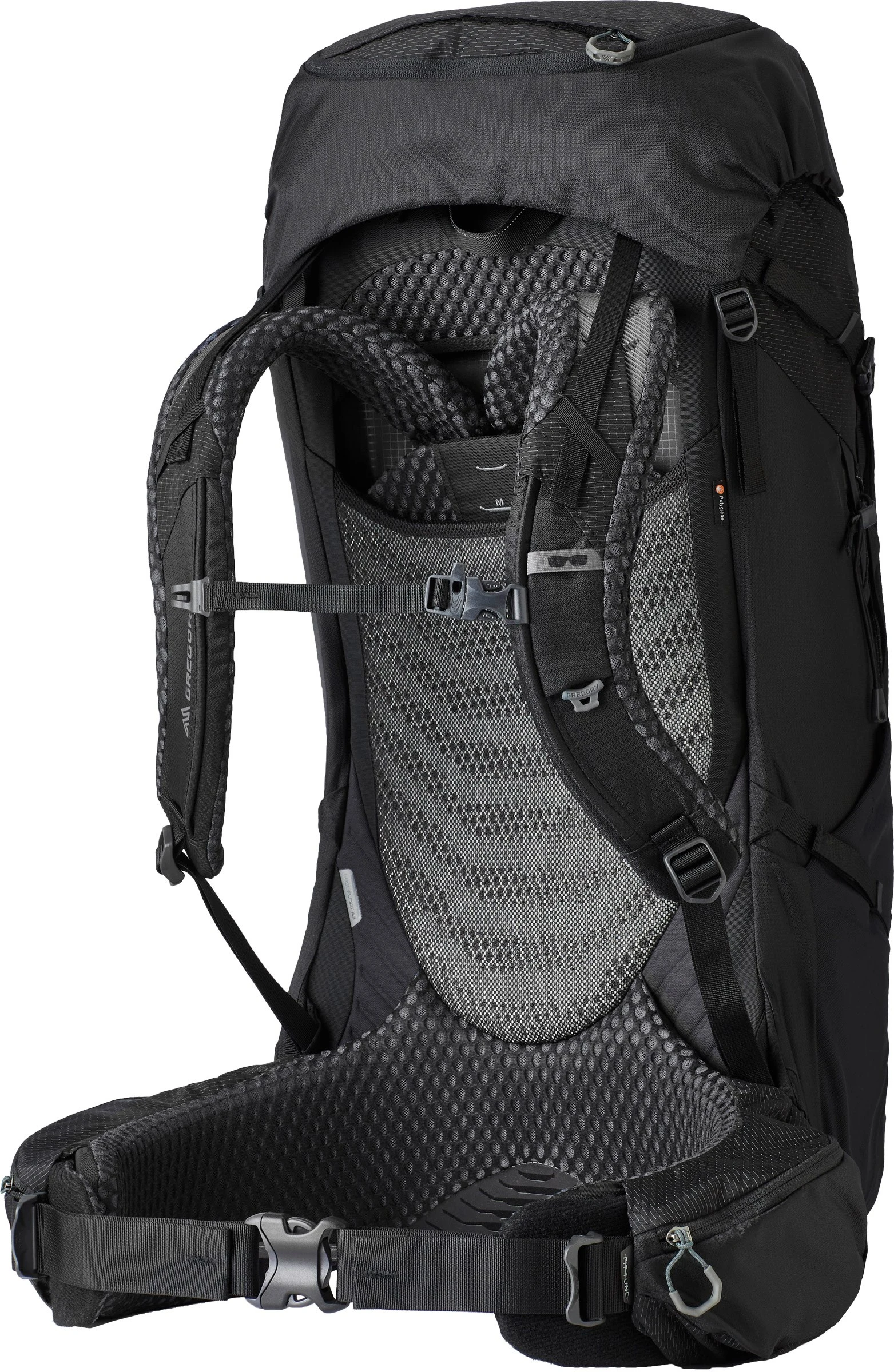 Kompressionsremmen under låget, de to ekstra lange i bunden og de to vinklede kompressionsremme i hver side af selve rygsækken får vægten godt ind til ryggen og minimerer effektivt eventuel overskudsvolumen. Kompressionsremmene i siden kan desuden trækkes henover fronten på rygsækken og lukkes sammen, hvis fx liggeunderlag eller snesko skal fastgøres på fronten. Topstrammerne over skulderremmene og sidestrammerne på hoftebæltet får trukket vægten ind til kroppen, og de let indstillelige top- og sidestrammerne muliggør desuden vægtforskydning, når der vandres i varieret terræn.