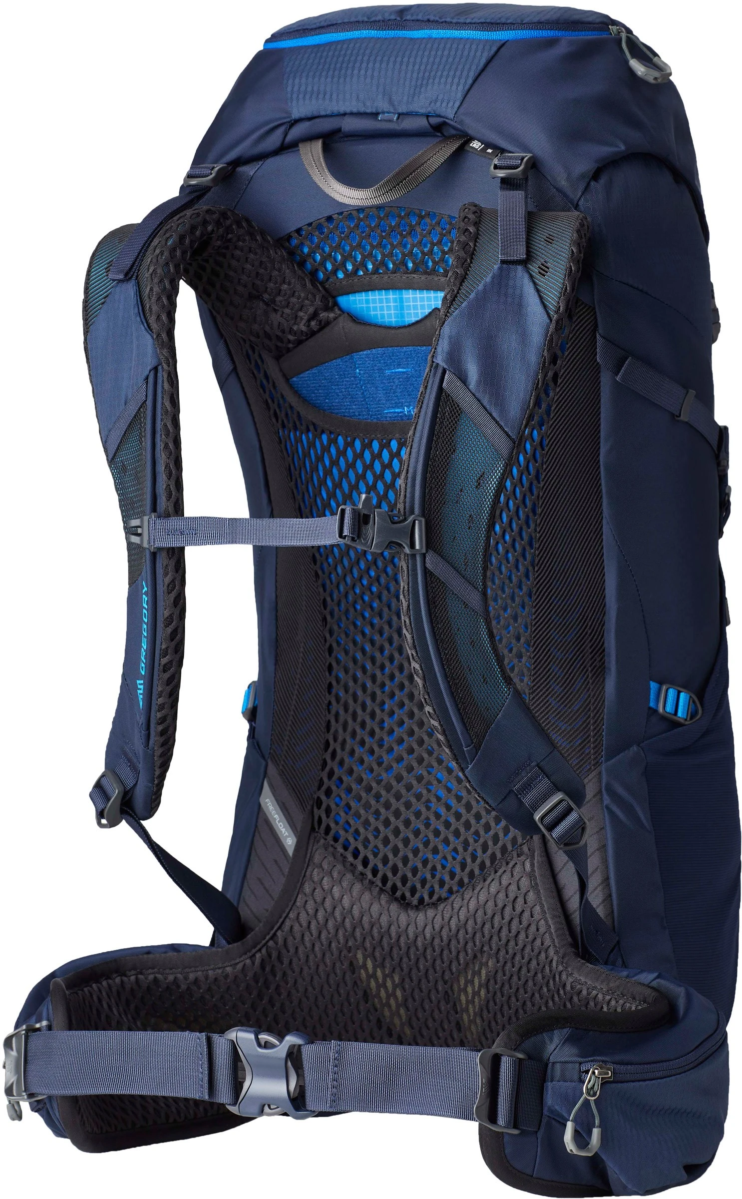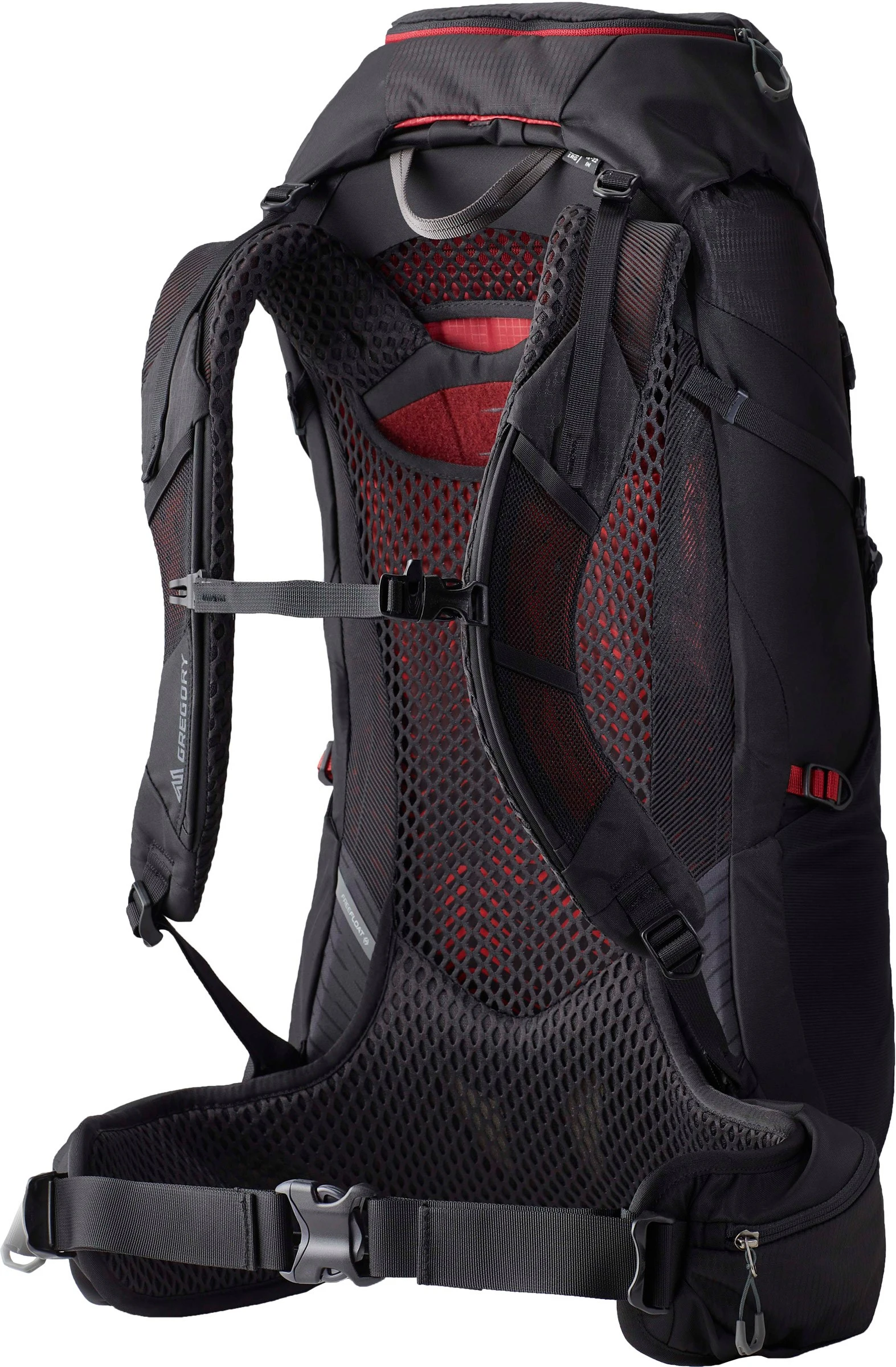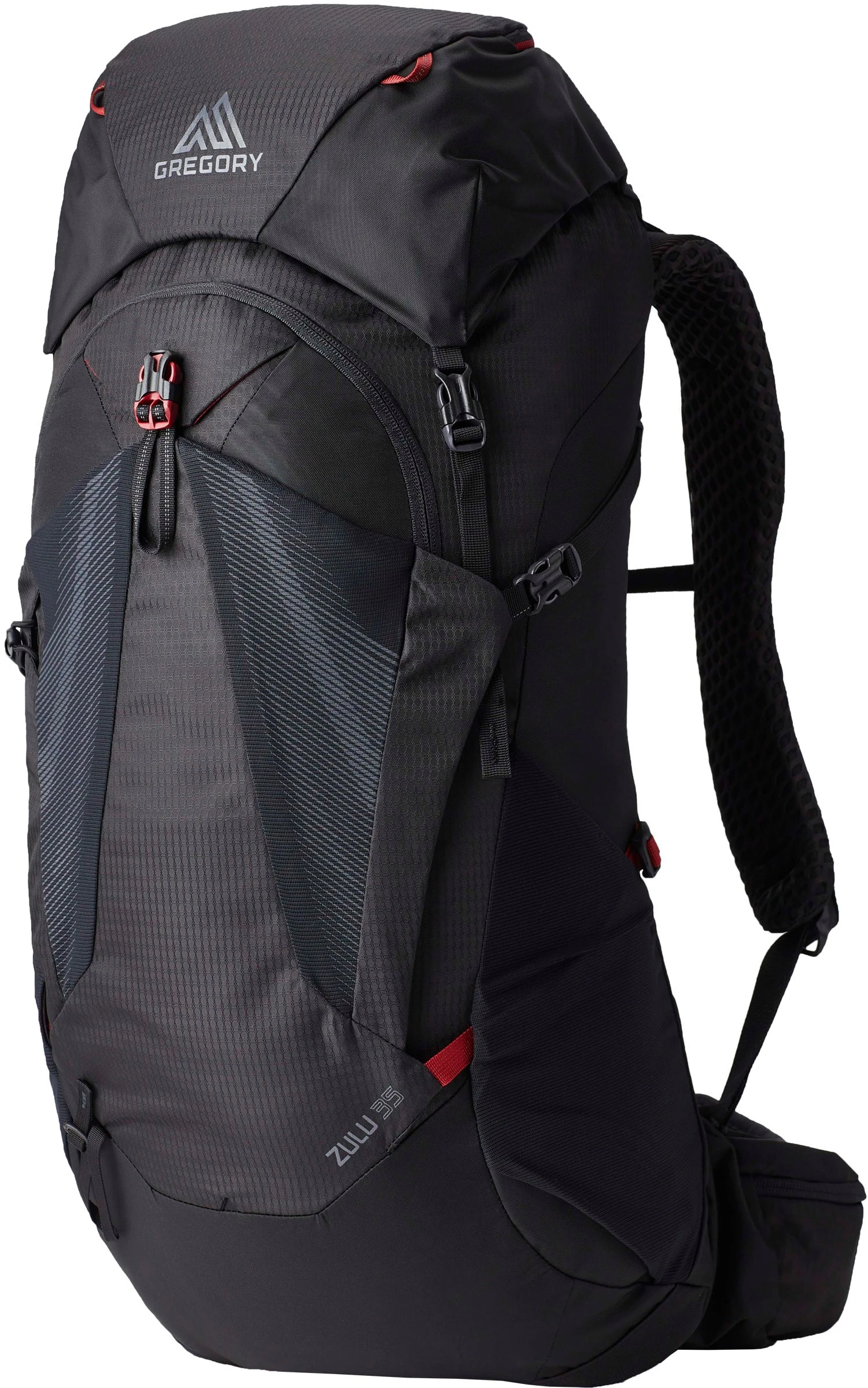 Gregory Zulu 35 M/L er udstyret med en rummelig stretch-lomme på hver side og en stor stiklomme på fronten til fx regnjakken, klatreselen eller det våde håndklæde. Sidelommerne er store nok til at sluge hver deres 1 liters drikkeflaske, hvis man da ikke lige anvender et drikkesystem, som rygsækken selvfølgelig også er forberedt til. Derudover kan der på fronten af sækken monteres trekkingstave, isøkse eller skovl ved hjælp af de smarte, integrerede anordninger og rygsækkens eventuelle overskudsvolumen komprimeres effektivt ved hjælp af de to remme på hver side og en under låget, som tilsammen desuden sikrer, at vægten kommer ordentligt ind til ryggen.