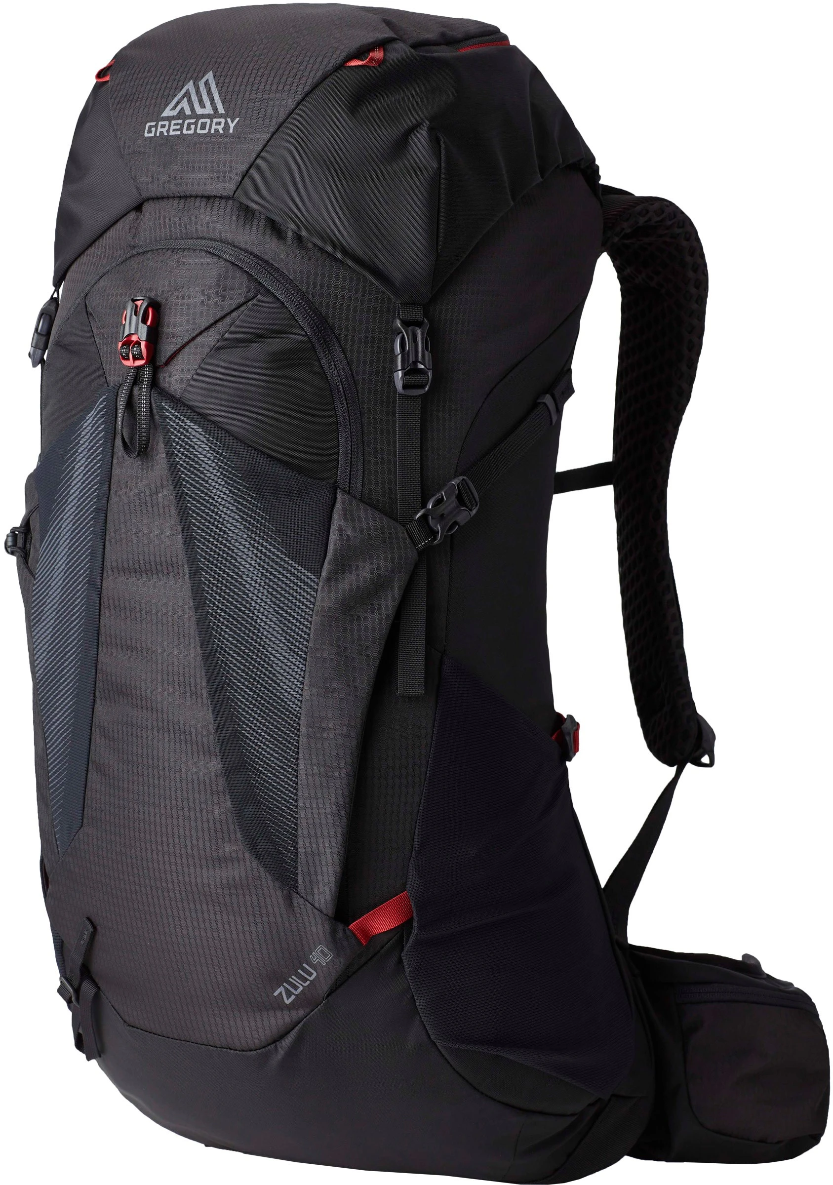 Gregory Zulu 40 M/L er udstyret med en rummelig stretch-lomme på hver side og en stor stiklomme på fronten til fx regnjakken, klatreselen eller det våde håndklæde. Sidelommerne er store nok til at sluge hver deres 1 liters drikkeflaske, hvis man da ikke lige anvender et drikkesystem, som rygsækken selvfølgelig også er forberedt til. Derudover kan der på fronten af sækken monteres trekkingstave, isøkse eller skovl ved hjælp af de smarte, integrerede anordninger og rygsækkens eventuelle overskudsvolumen komprimeres effektivt ved hjælp af de to remme på hver side og en under låget, som tilsammen desuden sikrer, at vægten kommer ordentligt ind til ryggen.