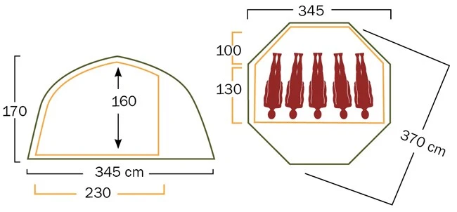 Kuppelkonstruktionen gør, at teltet får ekstra stejle vægge, hvilket afstedkommer en utrolig god plads indeni teltet og en rigtig god højde. Varanger Dome 4-6 er udstyret med tre store indgangsdøre, hvoraf de to er forsynet med vinduer, som giver godt med lys og mulighed for at følge med i vejrudviklingen. Myggenettet i indgangsdøren sørger – sammen med de justerbare ventiler og den regulerbare tophat – for at sikre et godt indeklima i teltet.