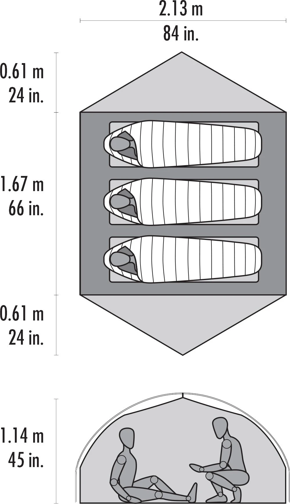 Trods den uhørt lave vægt er der ganske god plads til tre personer i det delvist selvstående Carbon Reflex™ 3 Ultralight Tent. Inderteltet byder nemlig på en liggelængde på 213 cm, en bredde på 167 cm og en reel siddehøjde i inderteltet på op mod 101 cm, hvilket levner ganske fin plads til tre personer. Og i modsætning til mange konkurrerende modeller, rejses Carbon Reflex™ 3 Ultralight Tent med en særlig stangkonstruktion med en centreret stang langs midteraksen og en enkelt tværgående, hvilket gør det ekstra rummeligt og ganske vindstabilt. Da teltet således er helt symmetrisk omkring en midterakse i teltets længderetning, er Carbon Reflex™ 3 Ultralight Tent udstyret med en meget rummelig apsis foran hver sideindgang i hele teltets længde, som er op til hele 61 cm. dyb, så der er plads til både de overnattendes rygsække, fodtøj og en gang madlavning i dårligt vejr.