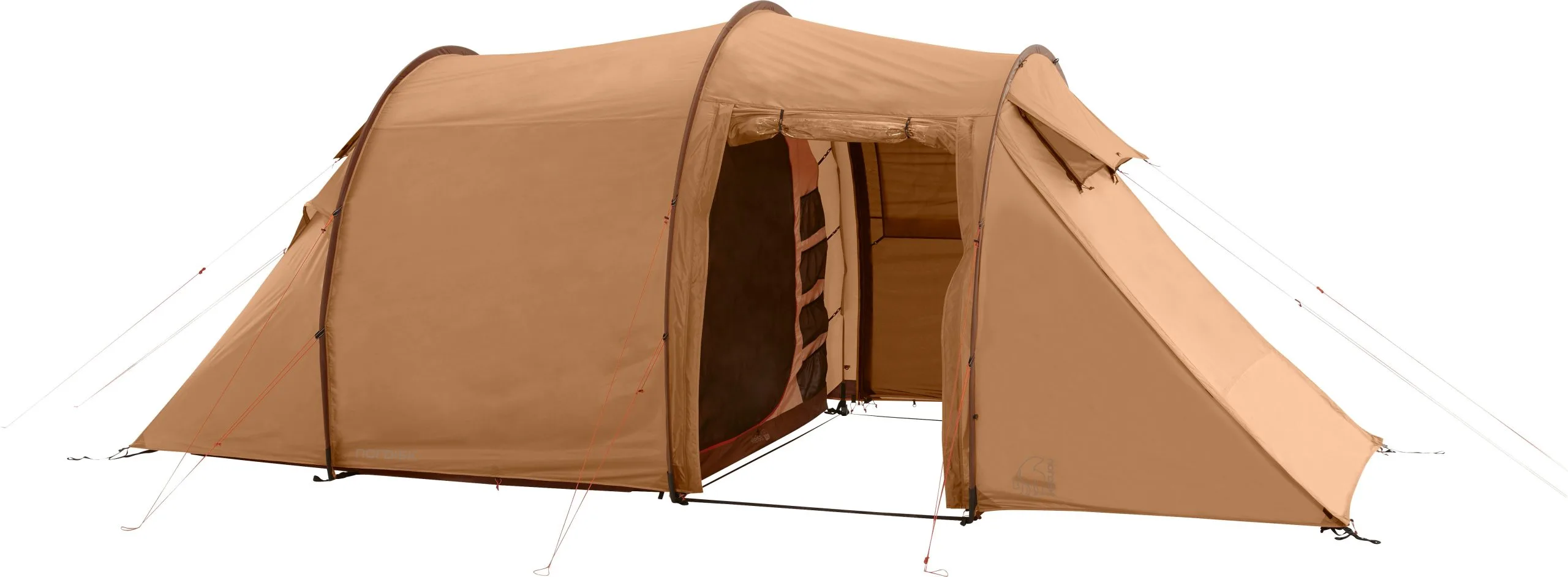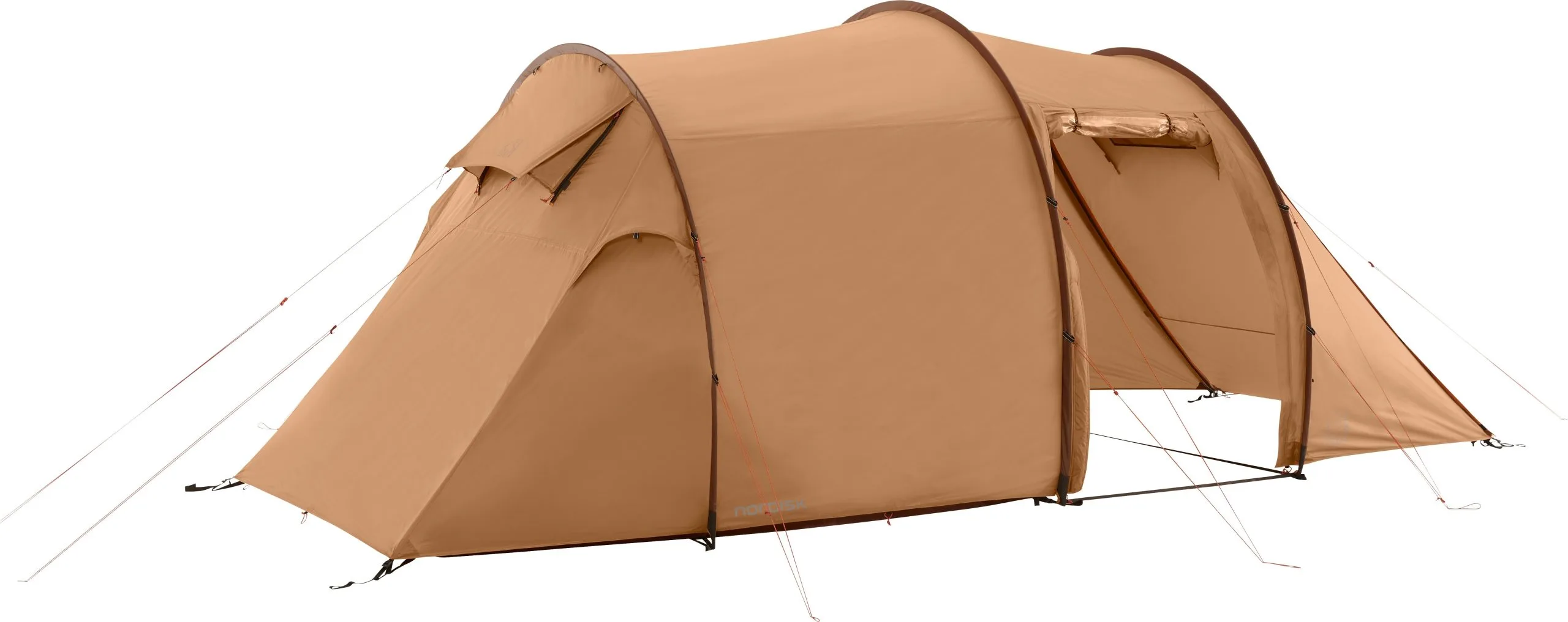 Nordisk Reisa 4 PU er et rummeligt og højt familietelt, som leveres med to sovekabiner, der giver fine overnatningsmuligheder for den større familie. Man kan dog vælge at afmontere fx den mindste kabine, hvormed apsisarealet øges betragteligt, ligesom man hermed kan gøre brug af den store åbning (med bagvedliggende myggenet) i fronten, som med de medfølgende stænger kan løftes op og øge det samlede overdækkede areal. Perfekt, når man om sommeren både vil have masser af luft i teltet og samtidig vil kunne sidde og nyde udsigten i skyggen eller i ly for regnen.