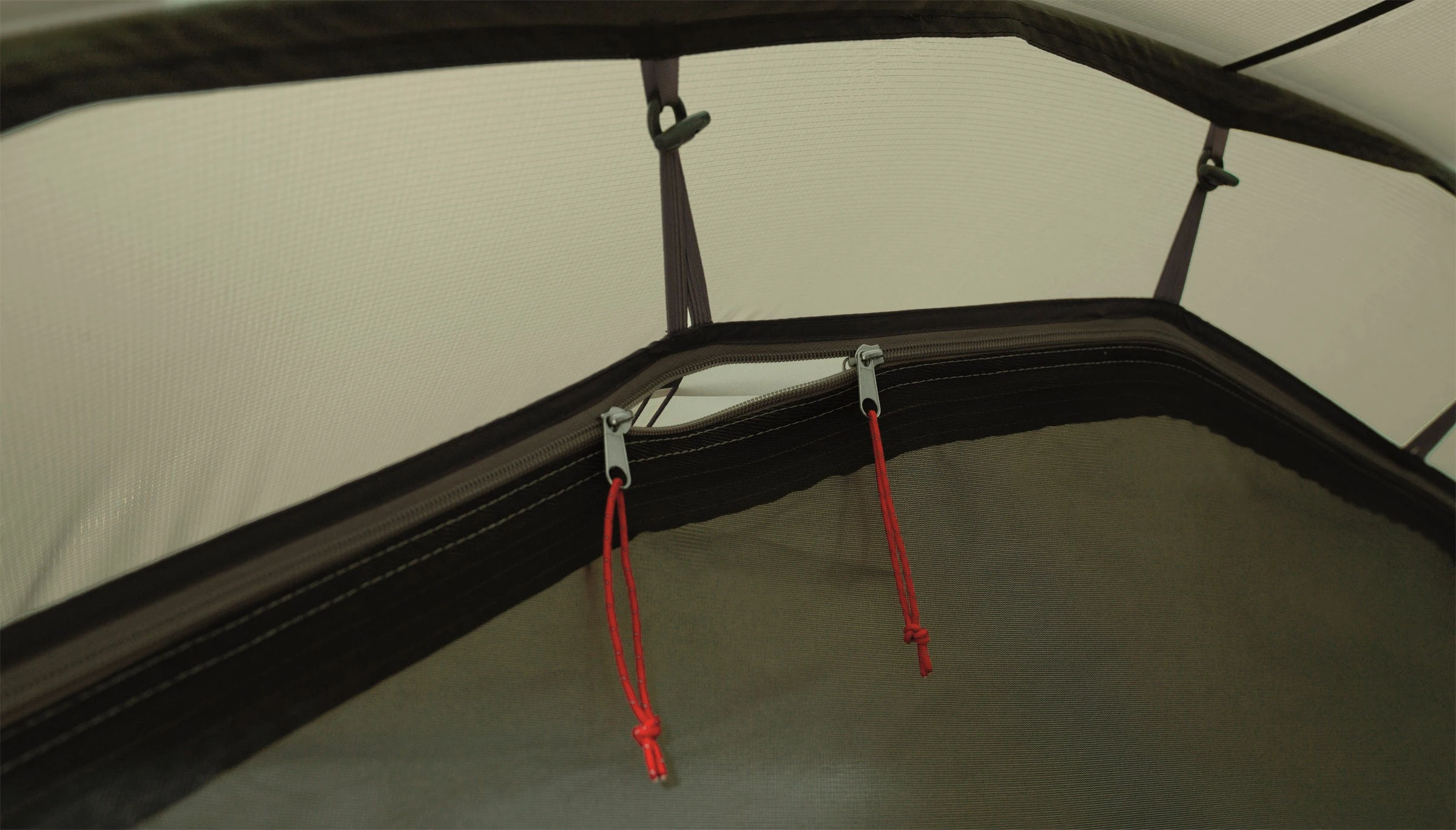 Alle spidsbelastningspunkterne – såsom bardun- og de justerbare pløkfæste – er naturligvis ekstra forstærket og de velplacerede og regntætte ventilskakter i oversejlet sørger for at opretholde det rette klima i teltet. De lynlåslukkede ventiler kan åbnes og lukkes efter behov – også indefra – og er naturligvis udstyret med ligeledes lynlåslukket myggenet, så hverken kryb eller snefygning lige finder ind. Og så kan alle barduner på oversejlet fikst bundtes op og samles i de til formålet fastgjorte løkker, så man dels slipper for kludder i alle bardunerne, når teltet pakkes ud, og dels undgår de flagrende barduner, hvis ikke alle lige er i brug – endnu en virkelig gennemtænkt detalje!
