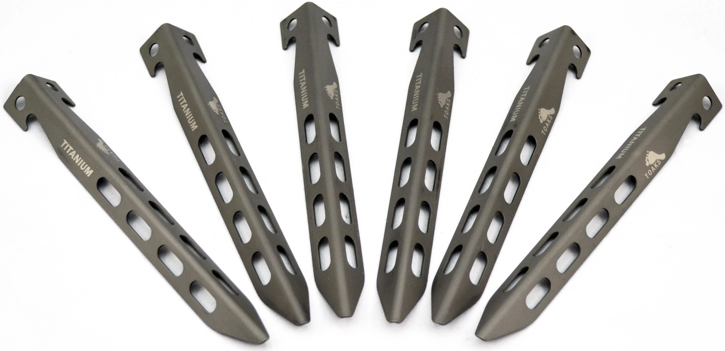 Dette Titanium Large V-Shaped Pegs, 6 pcs er et sæt med 6 stk. ekstra brede og V-formede pløkke i massivt titanium, hvor hver pløk har en længde på 16,5 cm. og hvor side af pløkken har en bredde på 14 mm, hvilket gør disse robuste pløkke velegnet til både blødere jord og lidt hårdere pakket sne.